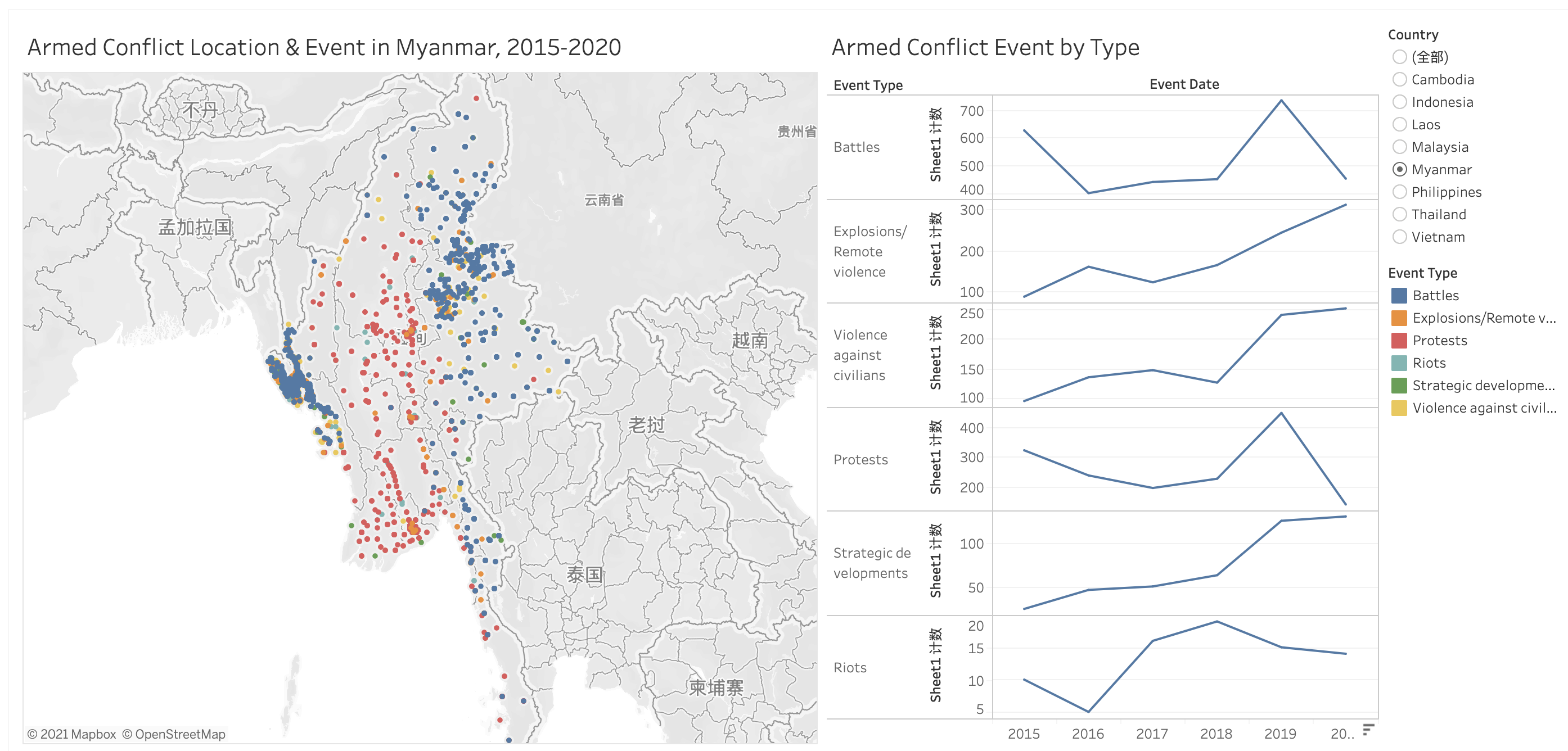 South-east Asia Armed Conflict Analysis is a data visualisation created to reveal the spatio-temporal patterns of armed conflict in selected South-east Asia countries between 2015-2020.
