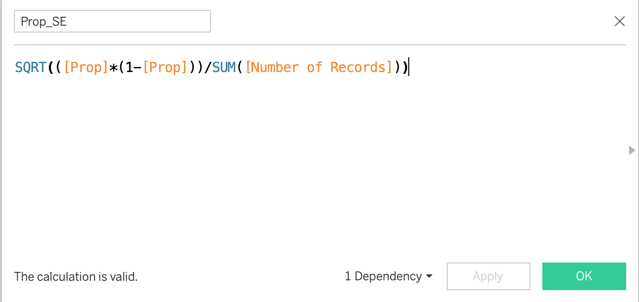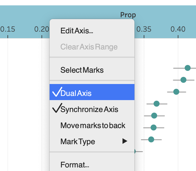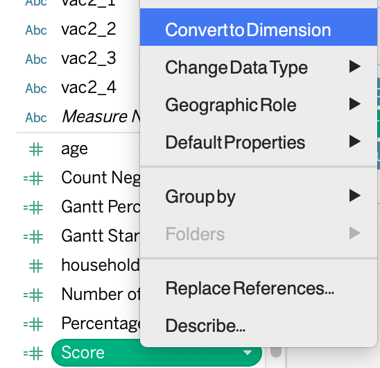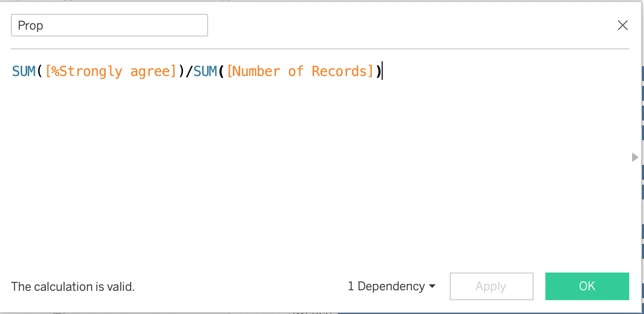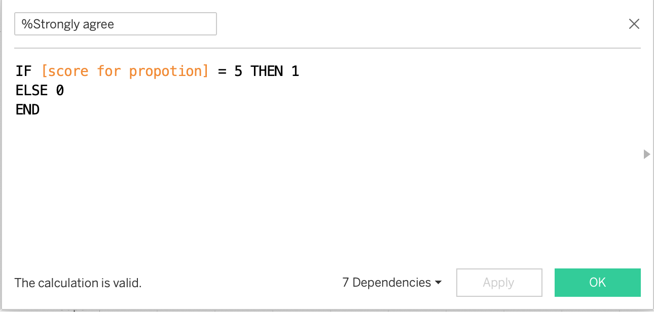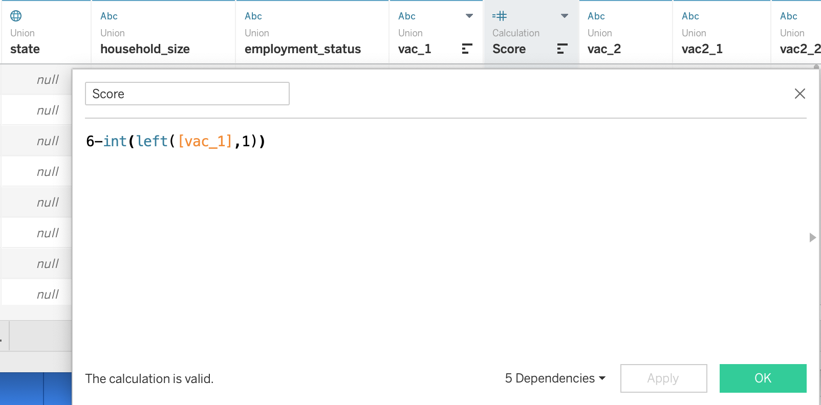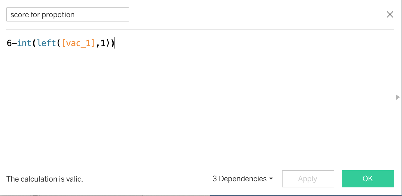 Formula is 6-int(left([vac_1],1)). The reason for using this formula is that I want strong disagreement and agreement to be shown as negative axis in the diverging stacked bar