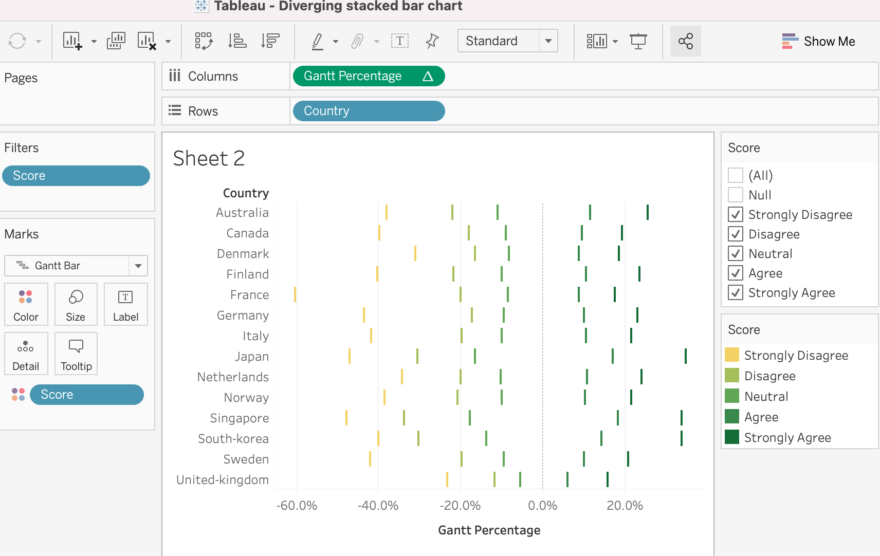 We can clearly see from the figure that United Kingdom is on the far right, indicating strong opposition to vaccines. This is the advantage of Diverging Stack Bar Chart to view each segment of opinion with Likert Scale data. Also, I added a clear legend to make the audience easy to visualize the chart. The progression of colors also has a visual effect, such as strong agree is red and agree is pink.