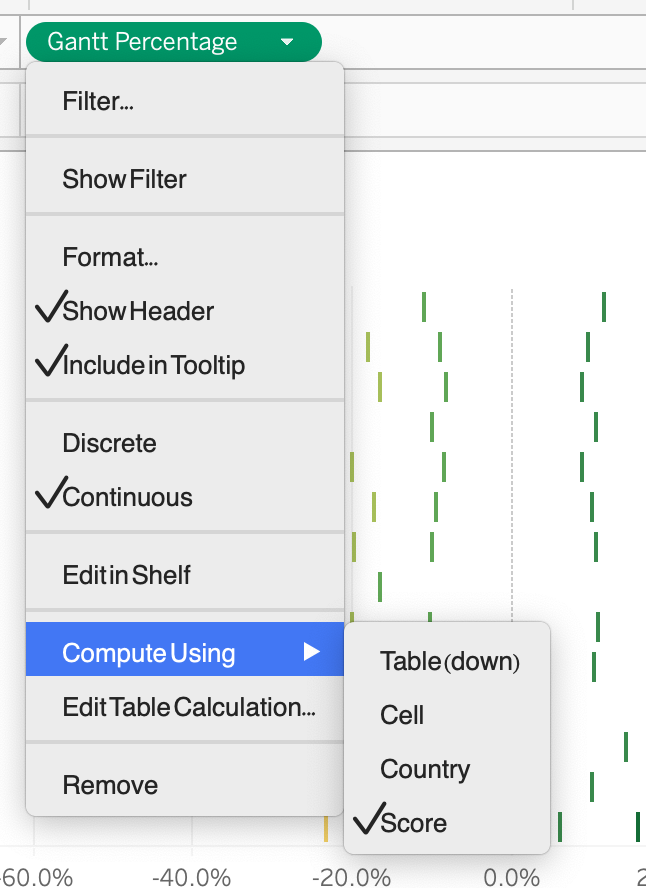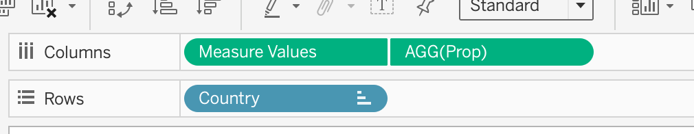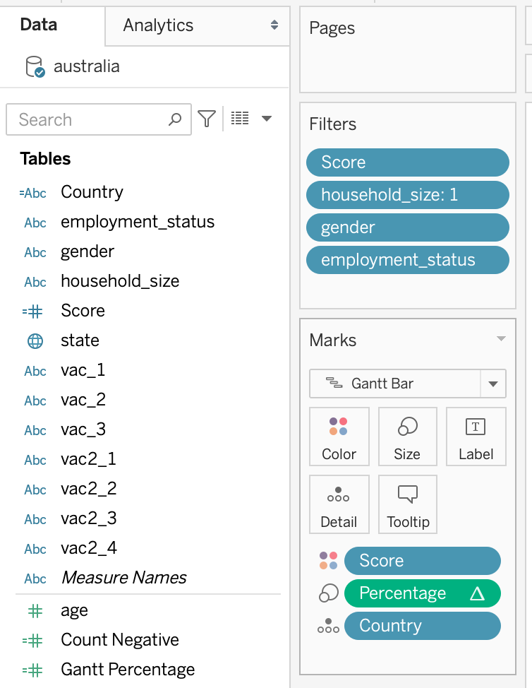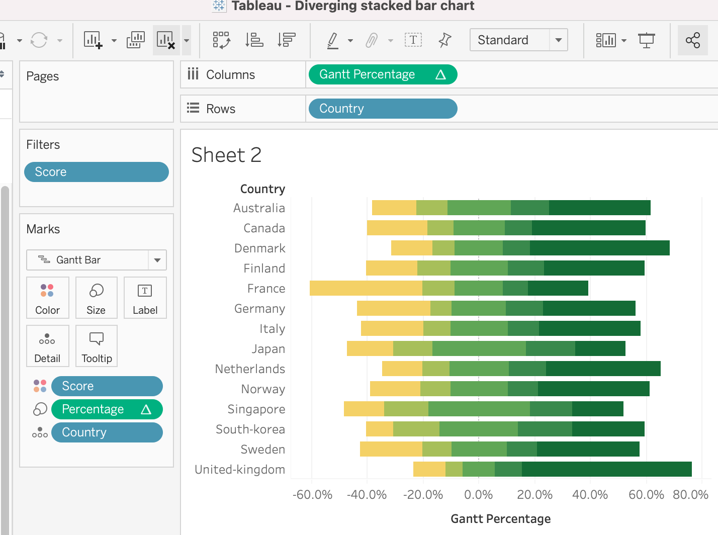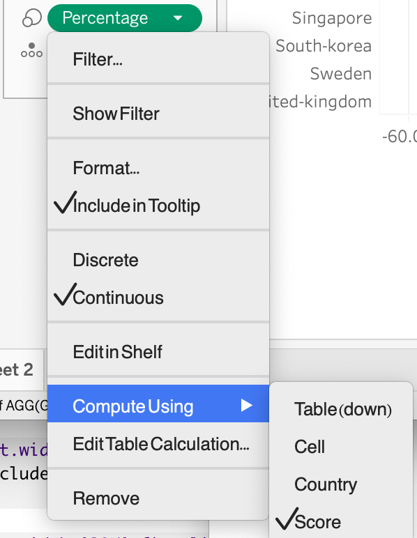 3.Drag score to Fliters, Grand Percentage to Column and country to Row